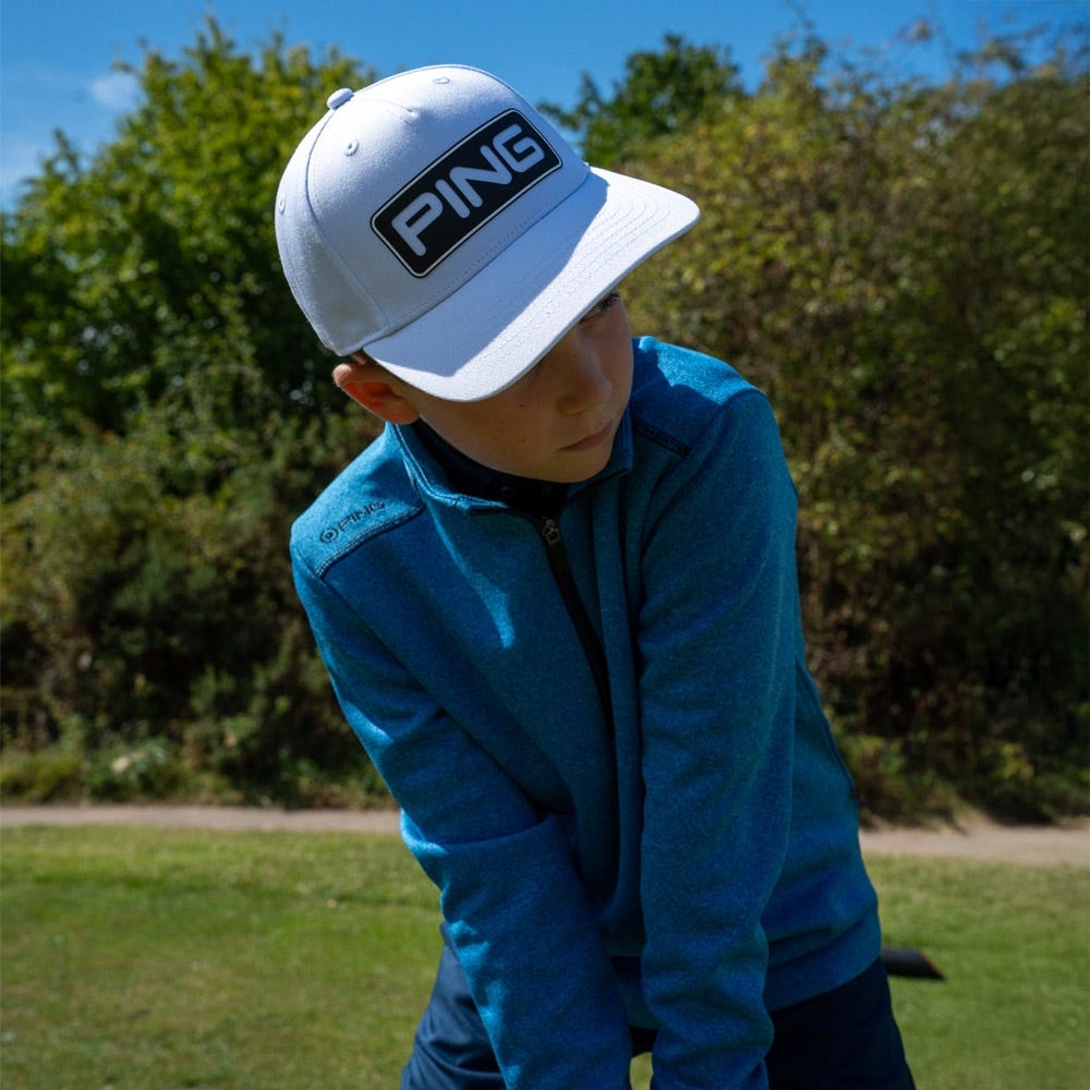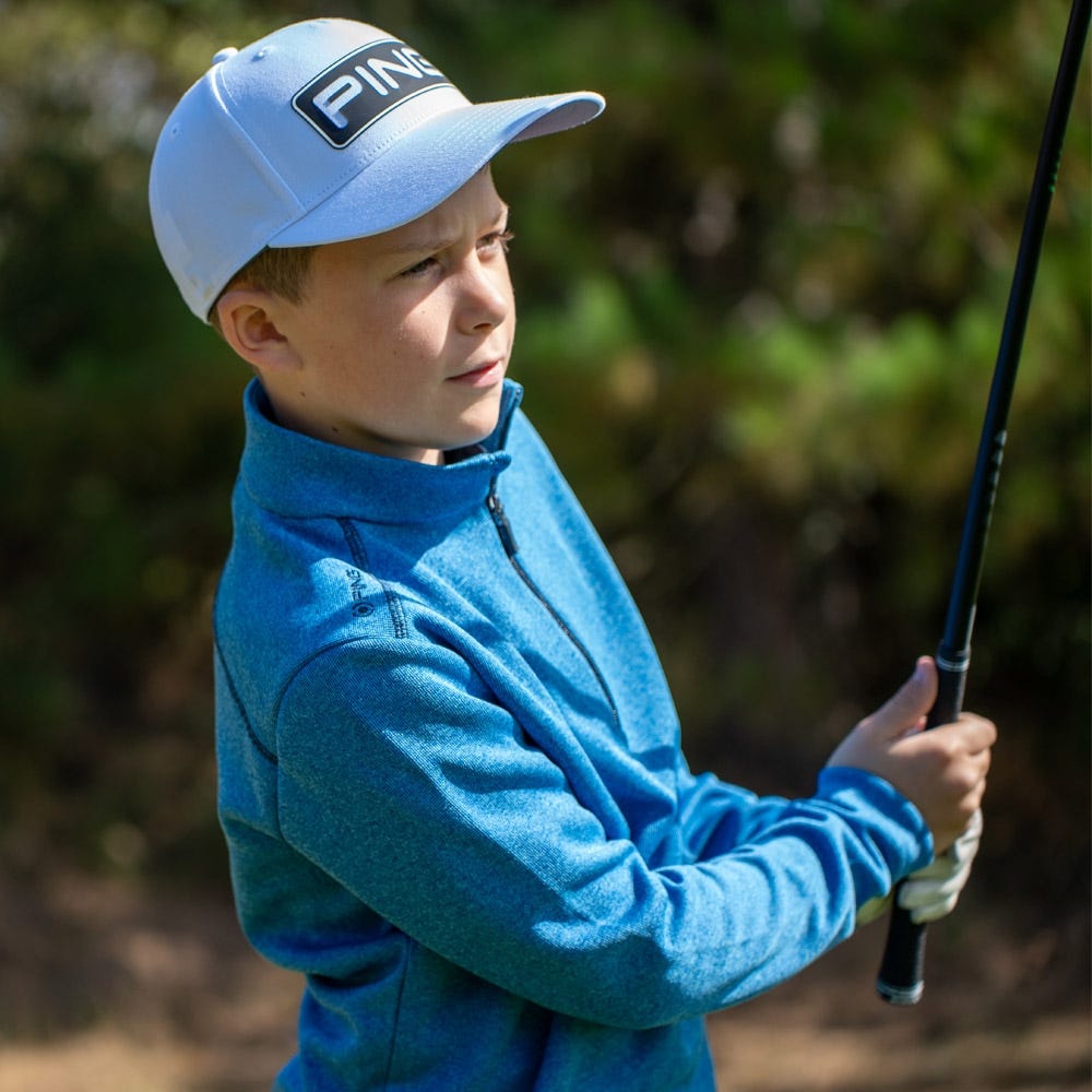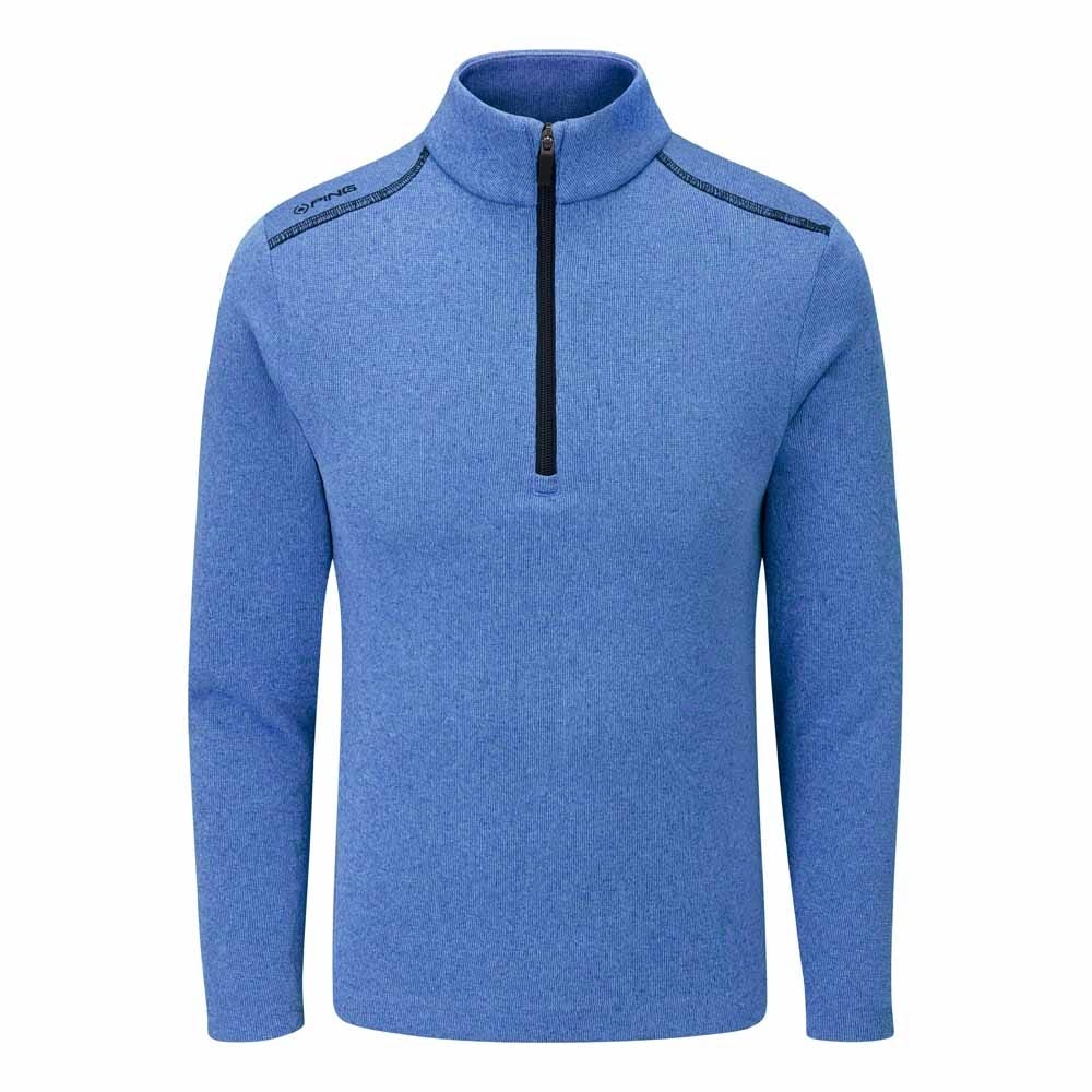Apportez une touche tendance à votre tenue de golf avec la veste polaire côtelée à demi-zip Junior Ramsey, disponible en bleu Snorkel Blue Marl.