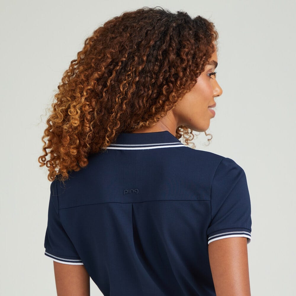 Conçu pour les golfeuses qui apprécient un style intemporel, le polo Viviana bleu marine est confectionné dans un tissu piqué léger pour un confort tout au long de la journée. Le col et les poignets à bord-côtes contrastés apportent une touche de contraste subtile, tandis que le pli dans le dos souligne sa silhouette féminine. Orné du logo PING dans le dos, ce polo est un choix polyvalent pour toutes les saisons. Associez-le à un pantalon de golf ajusté ou à une jupe-short pour un look soigné qui s’adapte aussi bien au parcours qu’au club-house.