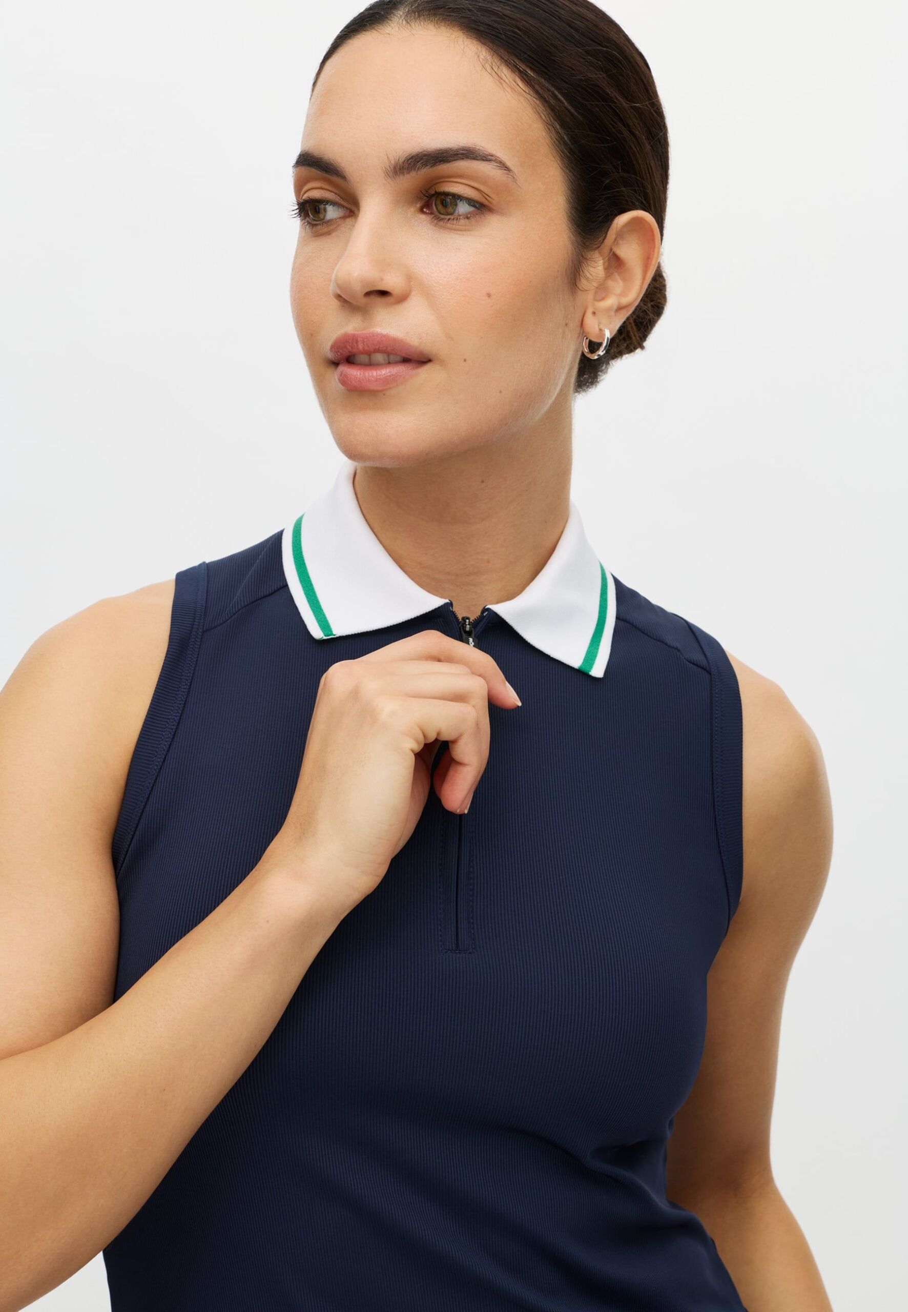 Le polo sans manches à côtes offre une liberté de mouvement maximale et un confort optimal lors des journées ensoleillées. La coupe sans manches avec dos nageur discret assure un confort optimal à chaque swing, tandis que le col zippé vous permet d’ajuster la chaleur. Un haut facile à assortir qui se marie aussi bien avec une jupe-short qu’avec un pantalon de golf léger.